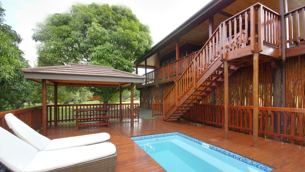 A house built on stilts, with pool and braai area