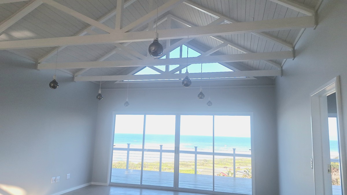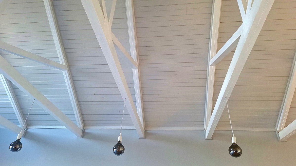 roof trusses visible on a high-pitch ceiling